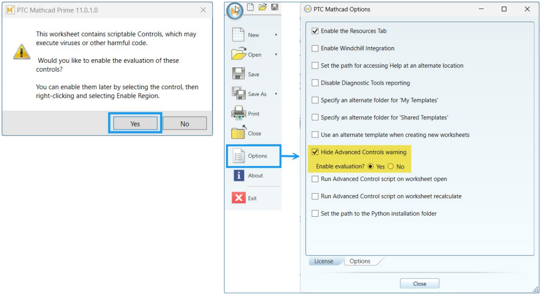 A. Choose "Yes". To prevent this message from recurring each time you open Mathcad, go to the main menu bar "Options", Check "Hide Advanced Controls warning".