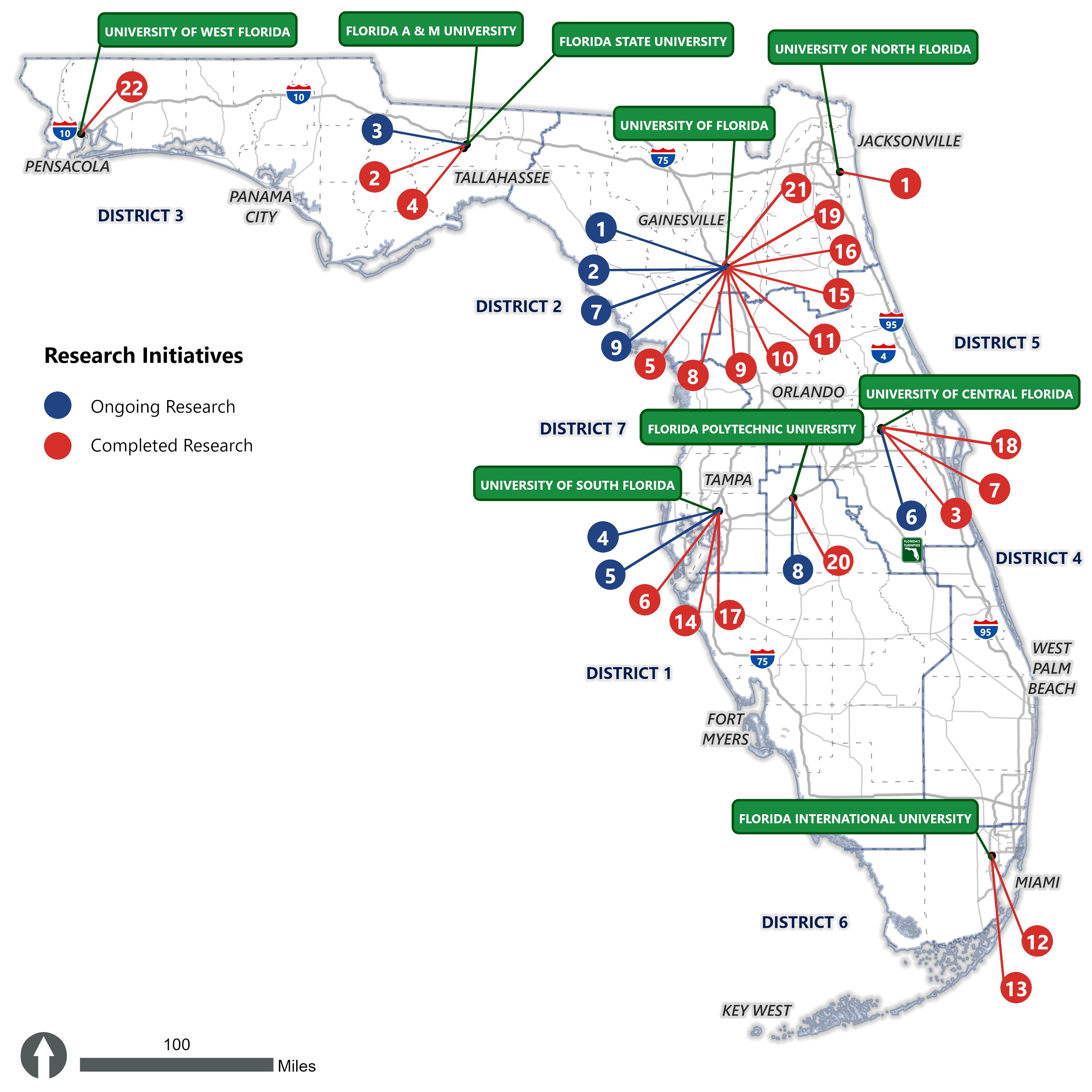 Research is an integral component of the Florida CAV Program. FDOT has partnered with multiple Florida universities for diverse research projects designed to help the Department in determining the effective use of technology for improving safety and mobility. This is achieved by ethical scientific conduct of research that increases global knowledge of best products, processes, and practices; and helps the department with implementation of these research.