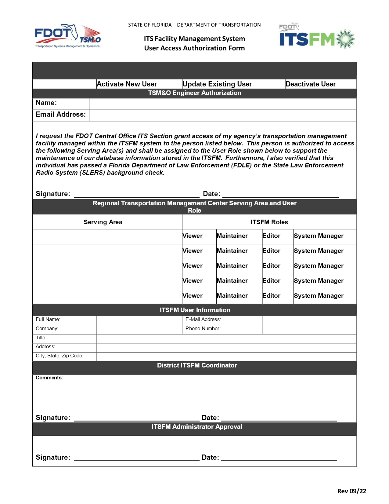Please use the ITSFM User Authorization form from the FDOT Central Office to grant access to users of the ITS Facility Management (ITSFM) system. The new user can then maintain the transportation management facilities managed within the District or authorized agency serving area(s). When completing the form, identify the authorizer and users contact information. Further, define the Serving Area(s) and User Role being authorized.