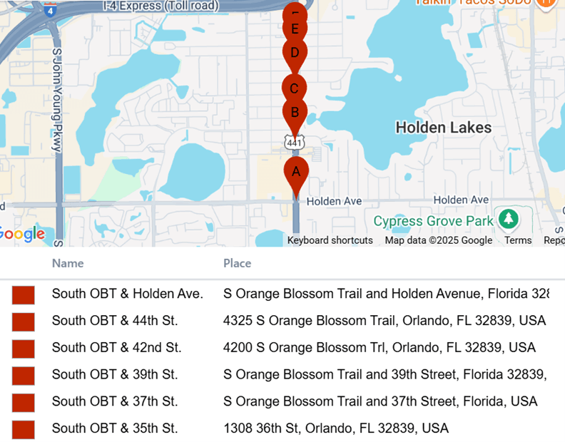 The Improvements under this Contract consist of Intelligent Transportation Improvements (Connected Vehicle Technology to Improve Pedestrian Safety) and Lighting on State Road 500/600 (Orange Blossom Trail) from Holden Avenue northward to 35th Street in Orange County.