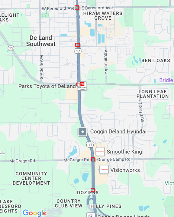 The US 17-92 CV project deployed, and tested connected vehicle technology and applications along five signalized intersections from Beresford Ave to Firehouse Rd in DeLand, Florida. The CV applications include Signal Phase and Timing, Emergency Vehicle Pre-emption, and Traveler Information Message.