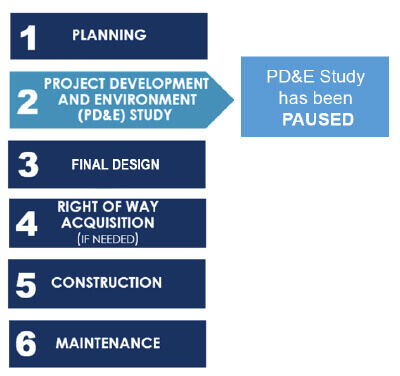 The Florida Department of Transportation (FDOT) has paused the Project Development and Environment (PD&E) Study along State Road (S.R.) 9/I-95 from north of High Meadow Avenue to the Martin/St. Lucie County Line in Martin County. The determination to pause the PD&E study was based on funding and financial constraints to implement this large and complex project.