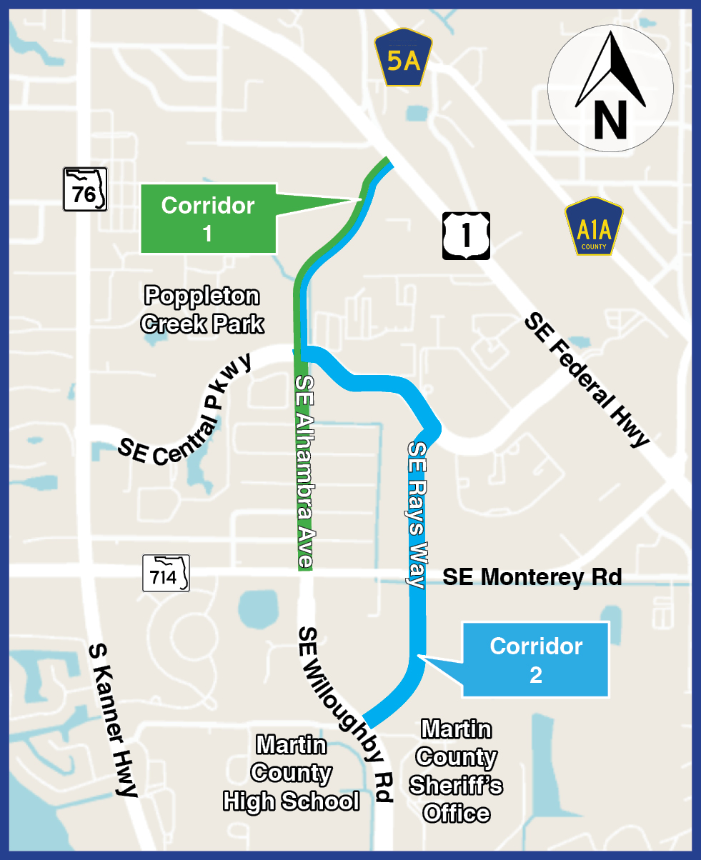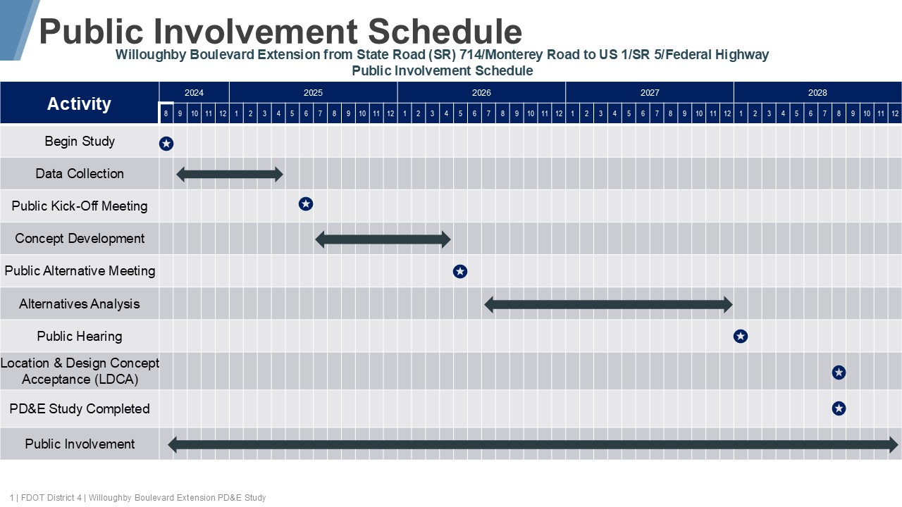The Florida Department of Transportation (FDOT) is currently conducting a PD&E Study for the Willoughby Boulevard Extension from State Road (S.R.) 714/Monterey Road to U.S. 1/S.R. 5/Federal Highway. A PD&E Study is FDOT’s process to evaluate the social, economic, and environmental impacts associated with a planned transportation improvement project. The purpose of this project is to provide system linkage in the roadway network by extending Willoughby Boulevard from its northern terminus and improve multimodal connectivity and mobility. A secondary purpose of the project is to address safety for bicyclists.