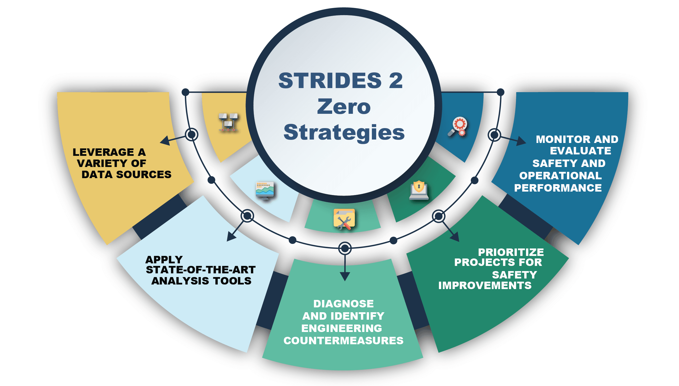STRIDES 2 Zero, which stands for State Traffic Roadway and Intersection Data Evaluation System Toward Zero Fatalities and Serious Injuries, is a statewide initiative operated by the FDOT Traffic Engineering and Operations Office to work toward the goal of eliminating traffic fatalities and serious injuries on our roadways. The objectives of this initiative are to enhance highway safety management practices in Florida through a data-driven process, provide engineering-based safety solutions for different transportation facilities and modes, and encourage implementation of technological advances in highway safety.